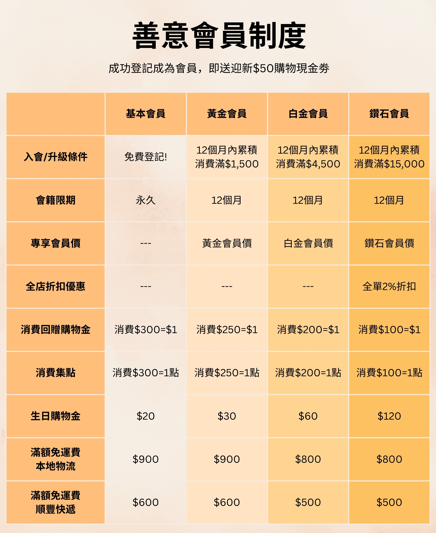 首次登記即可享受善意基本會員多項購物優惠,並且儲存送貨資料,在下次購物時節省填寫資料的時間。